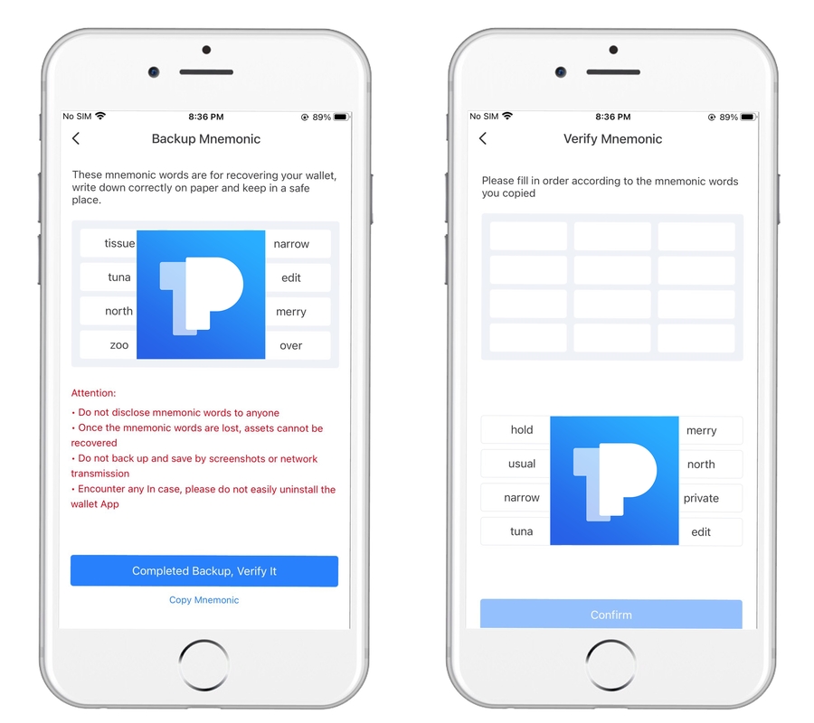 3、 The interface of "Backup Mnemonic" requires us to correctly record the mnemonic words according to the provided words and order. After confirming the record, click "Completed backup, verify it" to complete the verification of the mnemonic words in the correct order.